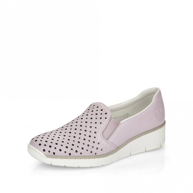 Rieker Shoes for women in a slip on, wedge style. These Rieker Ladies shoes have a lilac leather upper with circular designs and holes in the upper. This spring shoe has double elasticated gussets for easy on and off and to keep the foot secure. Rieker antistress insoles & cushioned outsole adds to the comfort of the shoe.