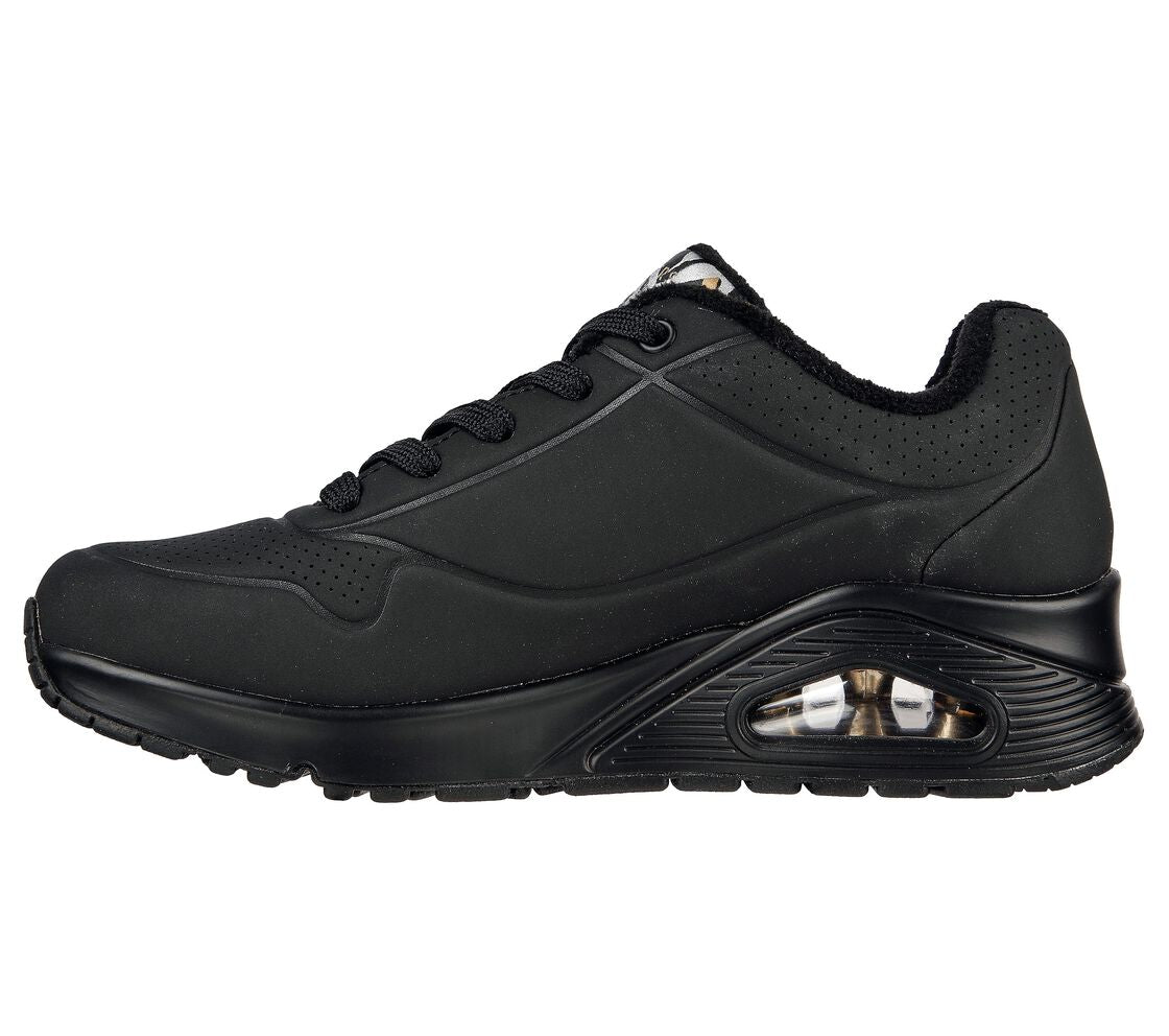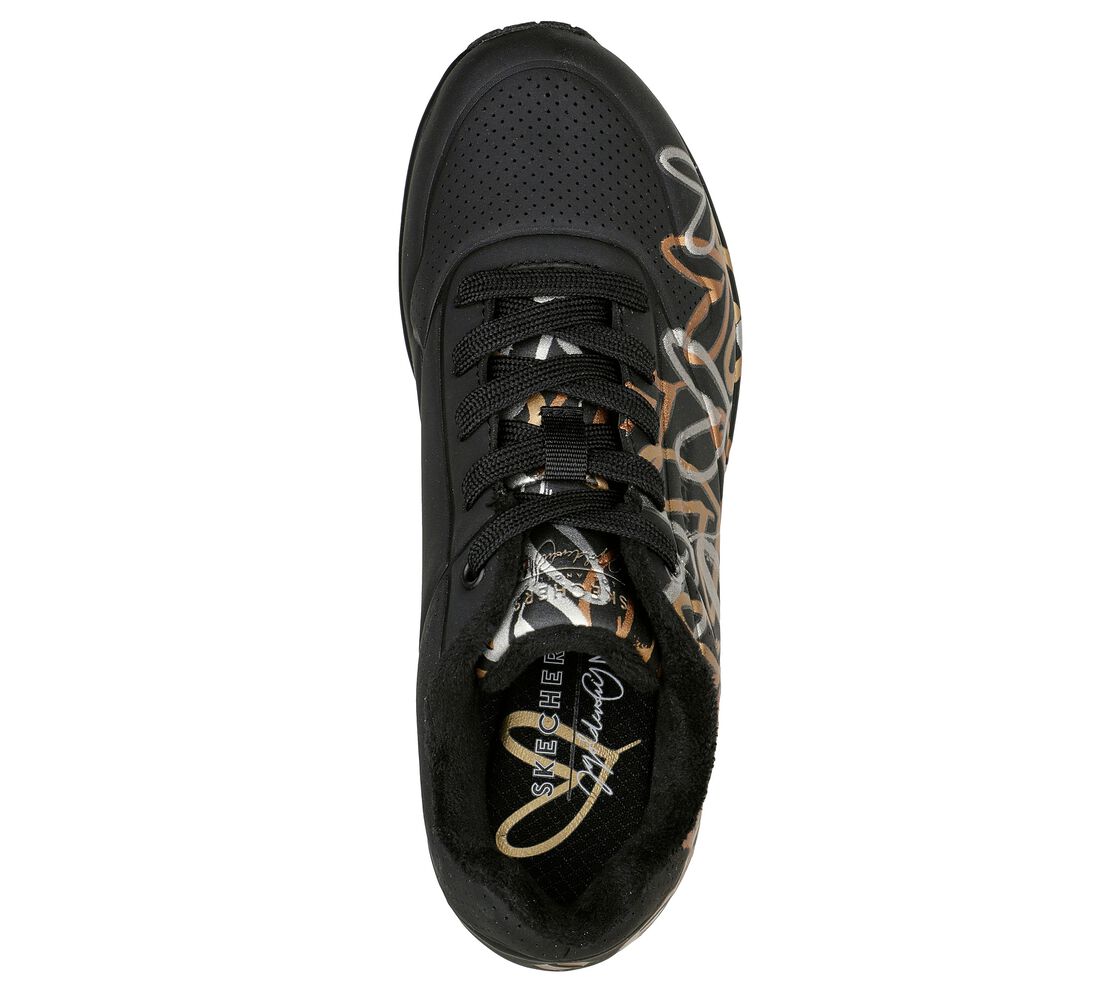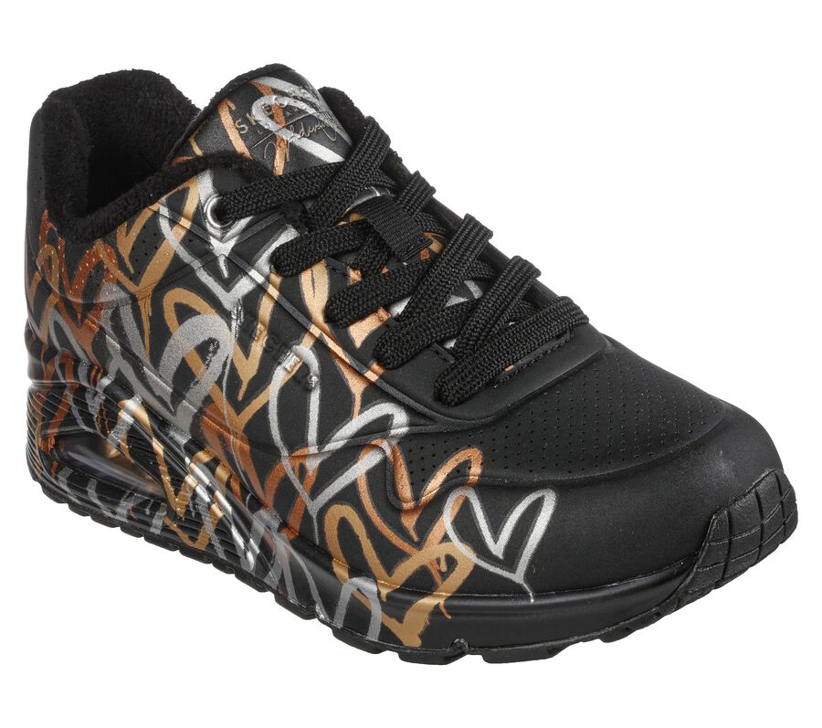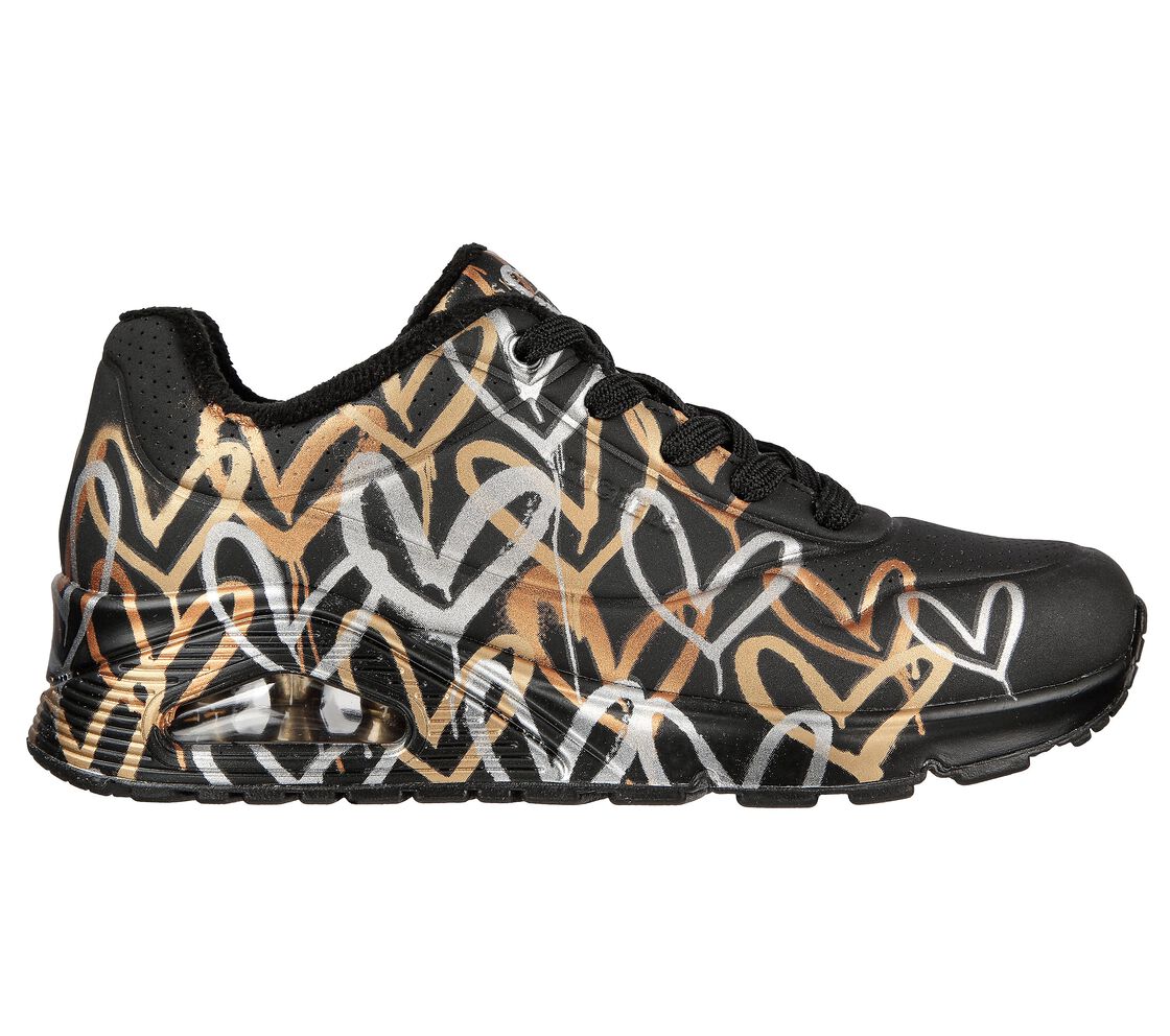 Internationally renowned muralist James Goldcrown brings his iconic #Lovewall heart designs to Skechers in this inspiring collaboration. Show off your creative style in Skechers x JGoldcrown: Uno - Metallic Love. This fashion lace-up features a metallic print of the artist's signature heart design on a synthetic duraleather upper with a Skechers Air-Cooled Memory Foam® insole and a platform wedge with visible Skech-Air® air-cushioned midsole.