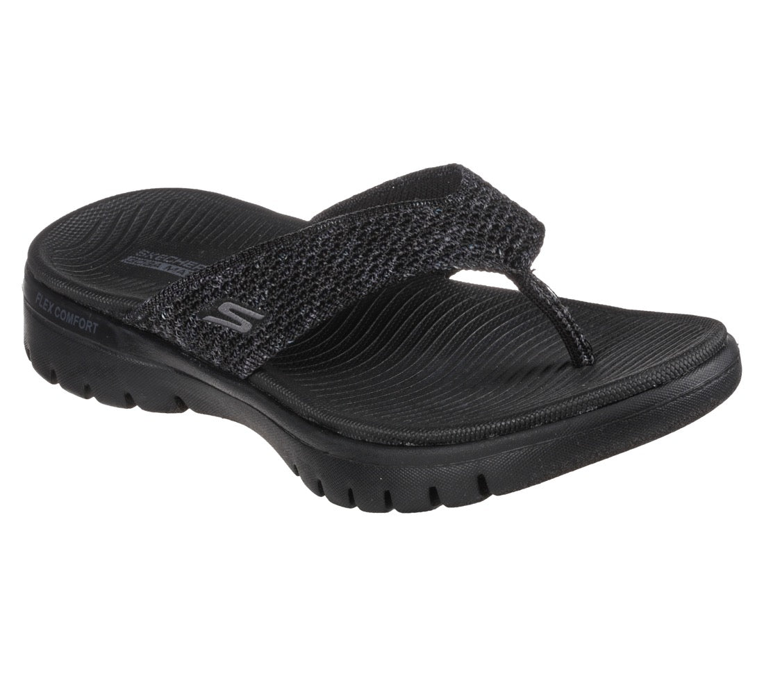 The Skechers On-the-GO Flex - Accent sandal will have you styled in cushioned comfort on those bright sunny days. This casual thong sandal features a woven space dye knit upper with a contoured Goga Mat footbed and an Ultra GO(R) cushioned midsole.