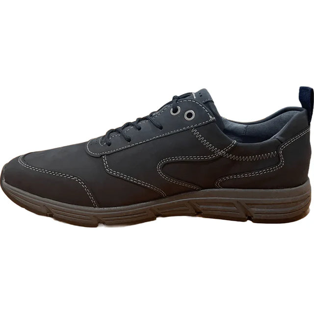 practical mens shoe from Waldlaufer with navy leather and synthetic uppers featuring stitching and a contrasting grey sole unit. Textile lined and lace fastened for a secure fit along with a handy side zip for easier access.